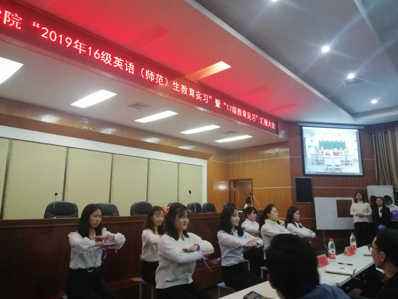大会伊始,主持人以教师职责作为开场,介绍出席本次大会的领导、嘉宾、实习队伍和评比规则。随后由金海中学实习队、凤凰中学实习队、张家界天门中学实习队、怀化三中实习队、国光中学实习队和新疆实习队六支队伍进行实习成功汇报,包括视频介绍,PPT展示和现场表演三个部分,实习队的精彩展示,生动再现了教学课堂,营造了热烈的现场氛围。每个小组结合实习情况,从教学工作、班主任工作和课外实践活动等方面,向大家展示了实习过程中的酸甜苦辣,方式各异、风格多样。