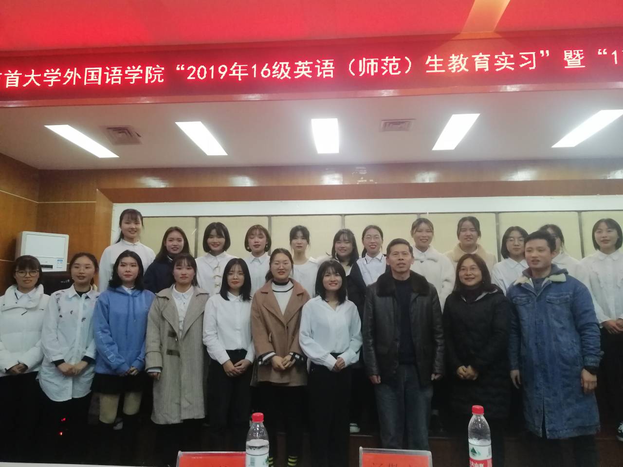 本网讯(通讯员 李干 奉洁 孙欣然 丁宇)在学院的大力支持和广大师生的共同努力下,2016级英语师范生教育实习工作圆满结束,并于12月4日晚7点在逸夫楼多功能报告厅举行了2016级英语师范生教育实习暨17级教育见习汇报大会,出席本次大会的领导及嘉宾有外国语学院汤敬安院长、教研室主任刘燕老师、翻译系龙鹏屹老师、教务办窦文祥老师,2016-2017级全体师范学生。