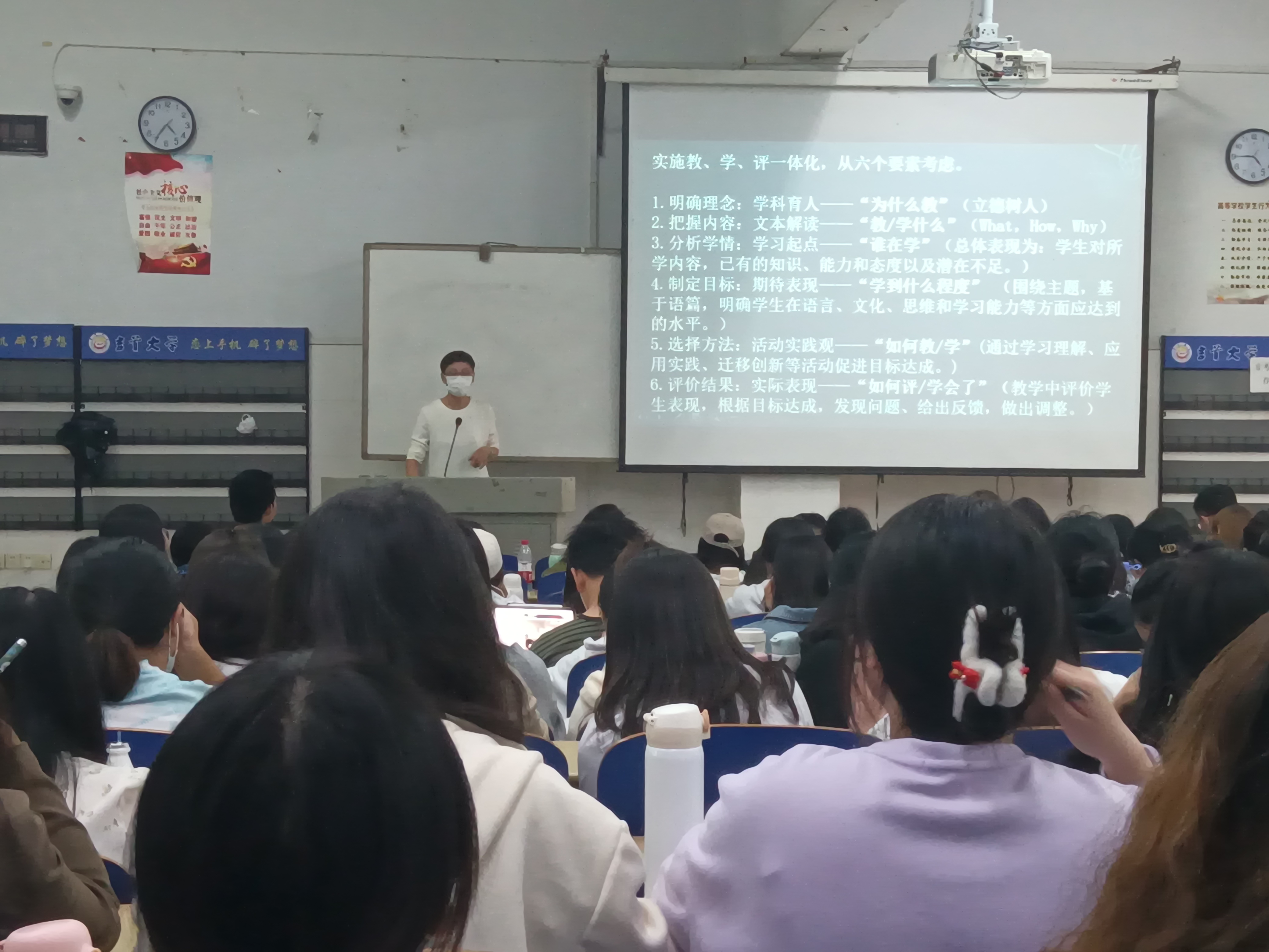 伍杰本次主讲主题系该专业限选课《中学英语课程标准与教材研究》中的一项内容。本堂课聚焦苏教版高中英语新教材必修第一册第三单元的一堂阅读课,课堂聚焦三个教学目标,即学生能够回答:何谓体化,为何实施体化,以及一体化何以能三个问题。她以QAR阅读策略的实施为切入点,通过案例给学生展示了在阅读教学中如何做到教、学、评体化。