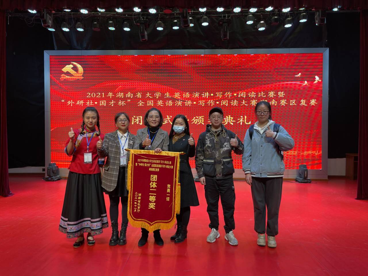 本网讯(修伟)11月26—28日,2021年湖南省大学生英语演讲、写作、阅读比赛暨“外研社﹡国才杯”全国英语演讲、写作、阅读大赛湖南赛区复赛在湖南工业大学举行。我校学子荣获一等奖3项,二等奖2项,三等奖2项,我校代表队获团体二等奖,一举揽获比赛各类奖项,为学校赢得了荣誉。