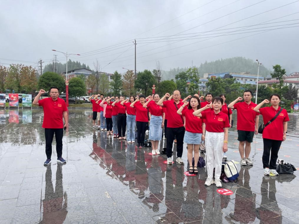在这里,全体党员同志不顾细雨绵绵,在学院党委书记简功友书记的带领下重温了入党誓词。并在支部副书记奉红平同志的带领下,宣读了师德师风誓词。