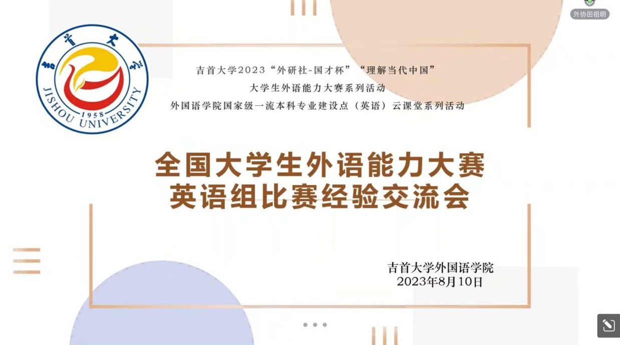 本网讯(通讯员朱芳东、侯璐、修伟)8月10日晚7:00我校“外研社·国才杯”大学生外语能力大赛英语组比赛经验交流会暨2023年“理解当代中国”外语能力大赛动员会在线上如期举行。活动由学校教务处主办,张家界校区教科研学中心协办,乐鱼(中国)承办,全校报名参加年度比赛的各专业本科生及硕士研究生近100人与会,会议由外语协同创新工作室来自2022级的英语师范生田祖明主持。