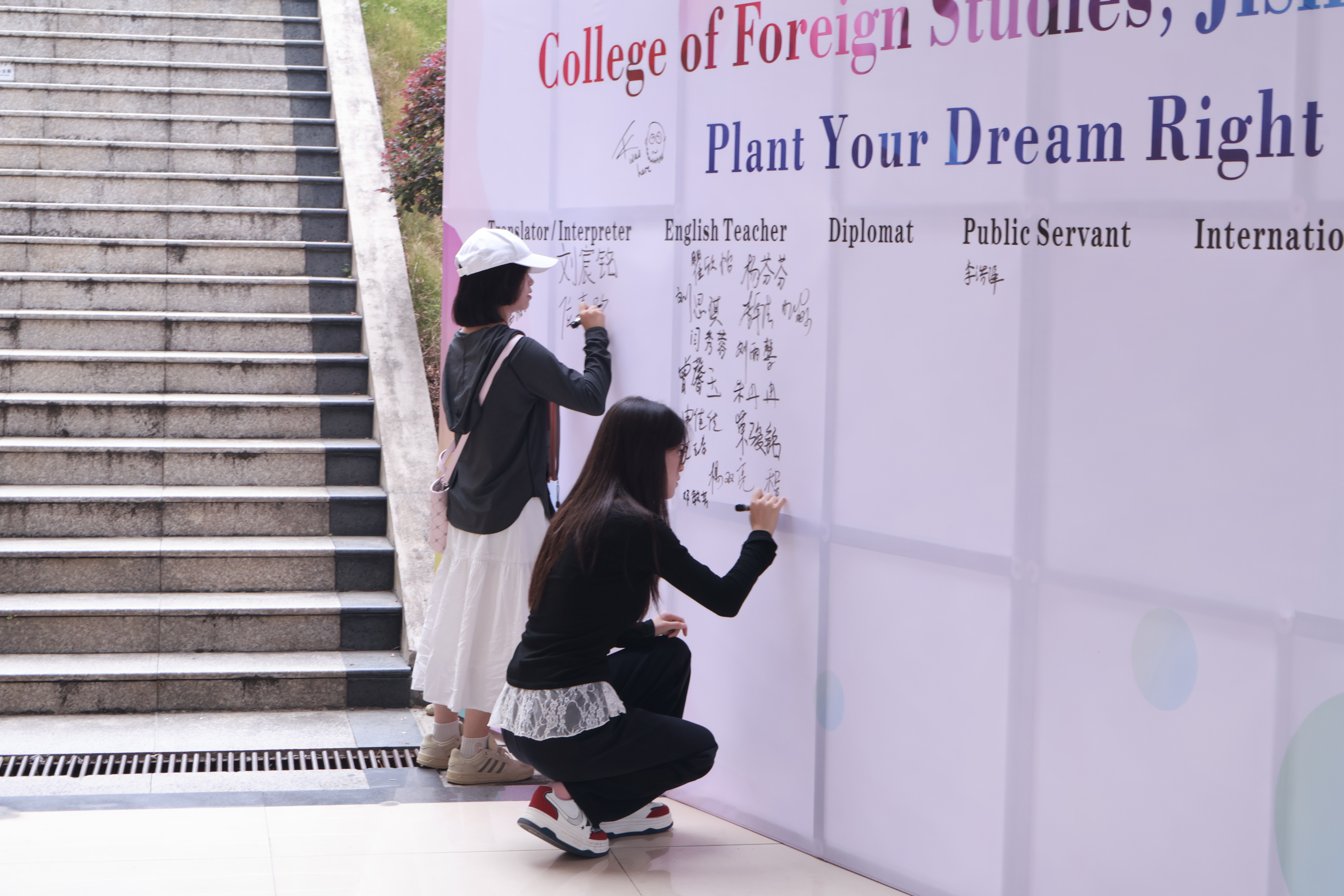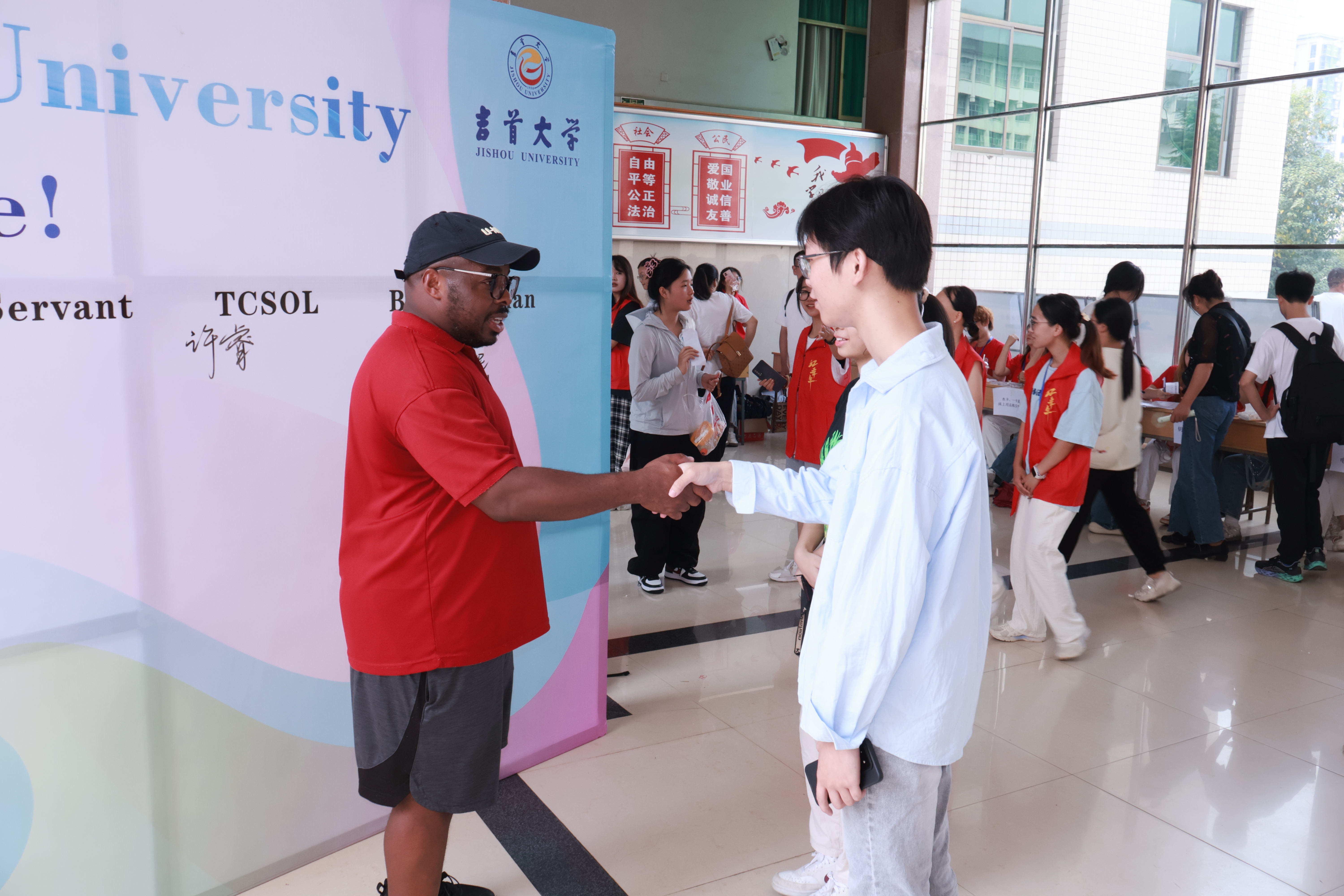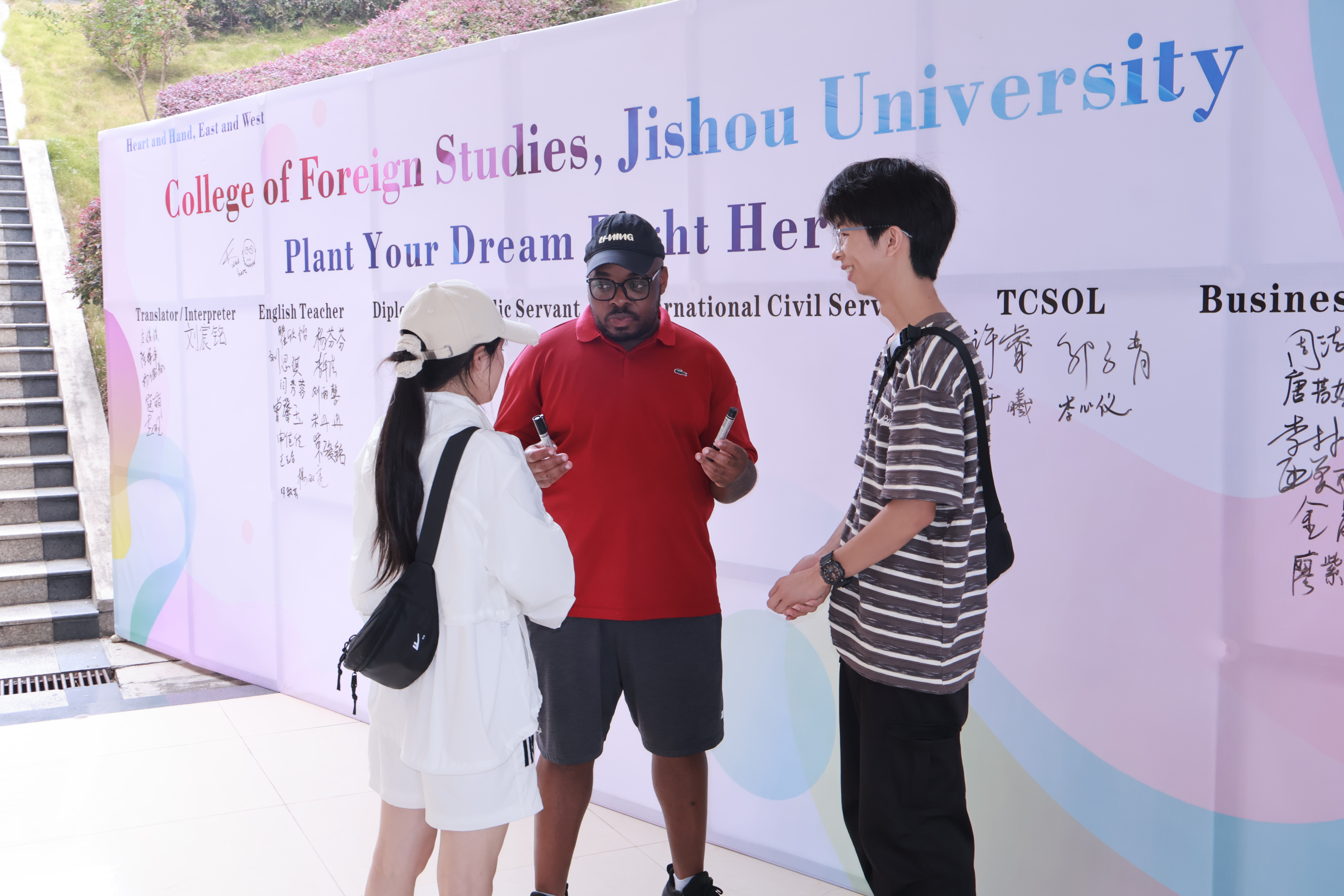 外籍教师Tu-Kwon Thomas,Latonya Smith 轮流全天候在张家界校区迎新现场等候新生,与新生逐一面对面交流。外教与新生寒暄问暖后,询问新生对外语类专业的认识,及今后的职业意向;引导新生在外语教师、口笔译者、外交官、公务员、国际组织职员、中文国际教育教师、企业家等诸多职业中做好选择和规划,在签名墙相应位置郑重签署姓名,并与外教合影留念。