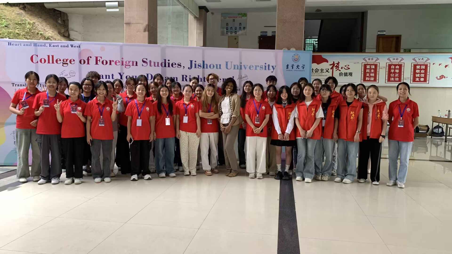 外教Latonya在签名墙与新生合影