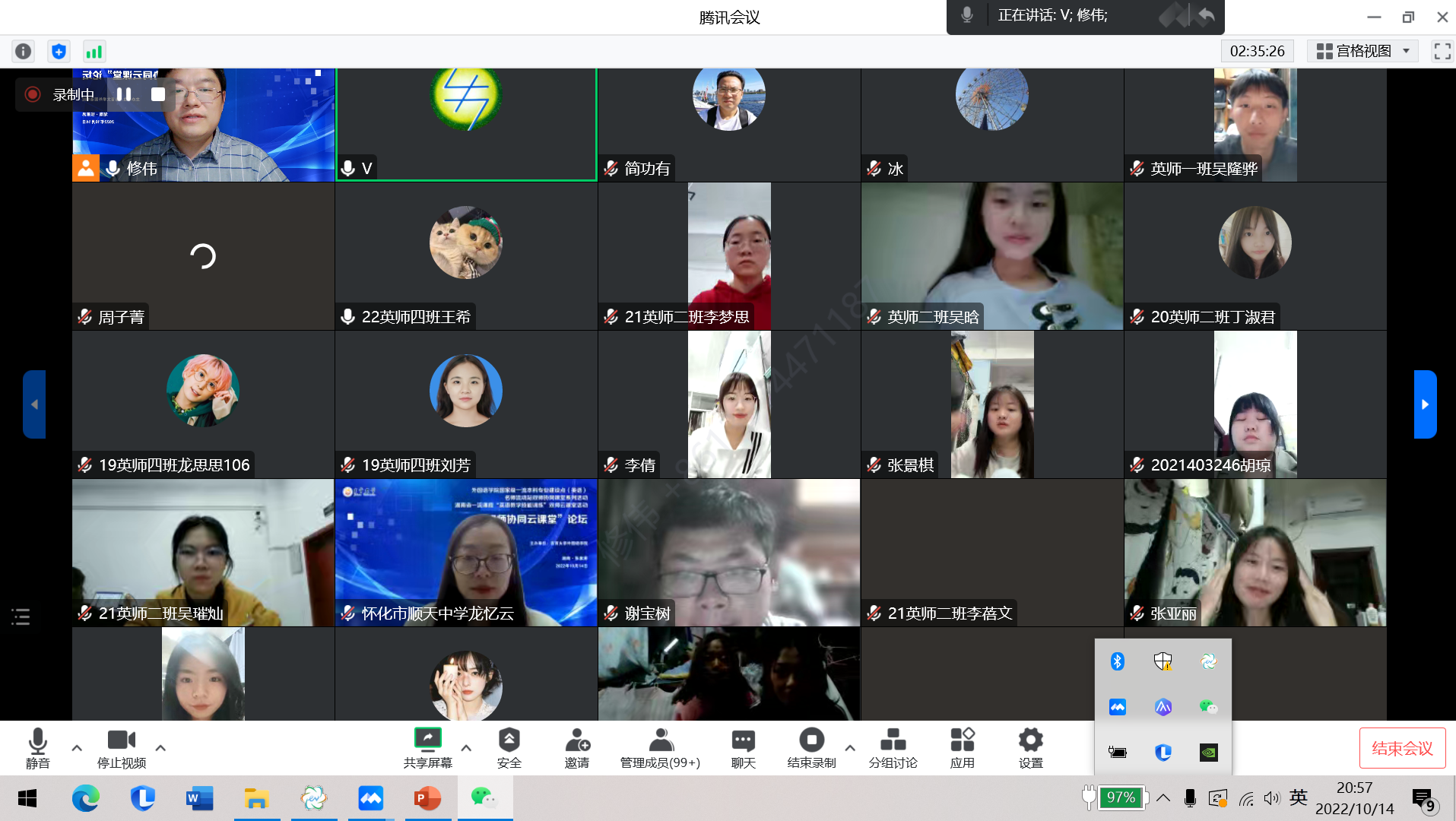 本网讯(修伟)10月14日晚,乐鱼(中国)名师流动站“双师协同云课堂”论坛在线上如期举行,邀请省级教学竞赛获奖者、来自怀化市鹤城区顺天中学石冰、龙忆云两位一线教师,以及我校中小学外语名师流动站首批驻站专家、来自张家界市教育科学研究院专职教研员伍杰作主题分享,拉开了该院为期一个月的国家级一流本科专业建设点(英语专业)名师流动站双师协同课堂系列活动暨湖南省一流课程(“英语教学技能训练”) 双师云课堂活动的序幕。该院院长刘汝荣、副院长简功友、外语教师教育课程团队教师及2019级、2020级全体师范生近300人与会。论坛由该院教师修伟主持。