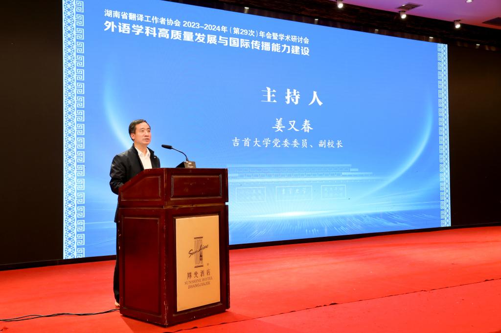 开幕式上,校长黎奇升教授致辞,他对湖南省译协和兄弟单位莅临吉首大学表示热烈欢迎,对省译协和兄弟单位长期以来对我校外语学科建设发展的支持表示感谢。他表示我校高度重视包括翻译学在内的外语学科建设,将翻译学科建设列入学校国际化发展战略,翻译学科在服务学校发展战略,与优势学科互动双赢方面具有广阔前景。开幕式由我校党委委员、副校长姜又春教授主持。