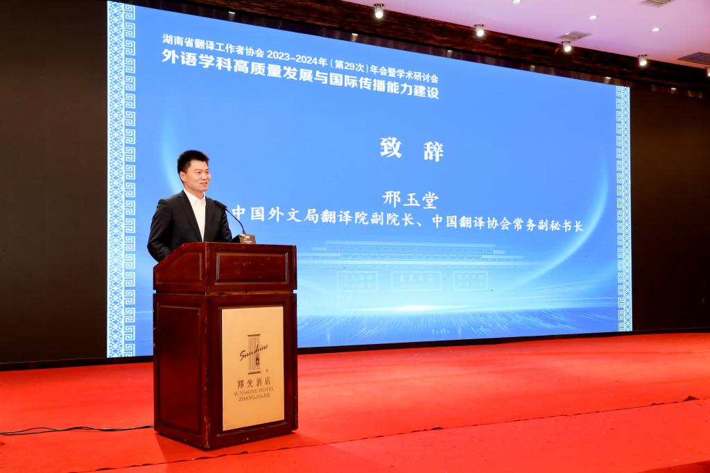 中国外文局翻译院副院长、中国翻译协会常务副秘书长邢玉堂在致辞中指出,翻译是推动中国式现代化进程、促进中外交流互鉴的重要力量,翻译行业应更好服务国家工作大局,创新人才培养模式,深化协同协作,形成工作合力。他表示中国译协将加强行业规划,与各方携手努力,共同探索高端翻译人才培养新模式,推动我国翻译行业高质量发展。省翻译工作者协会会长曾艳钰教授总结了过去一年译协取得的工作成绩并呼吁省内译届精诚合作,共同开创我省外语教育与翻译事业新篇章。