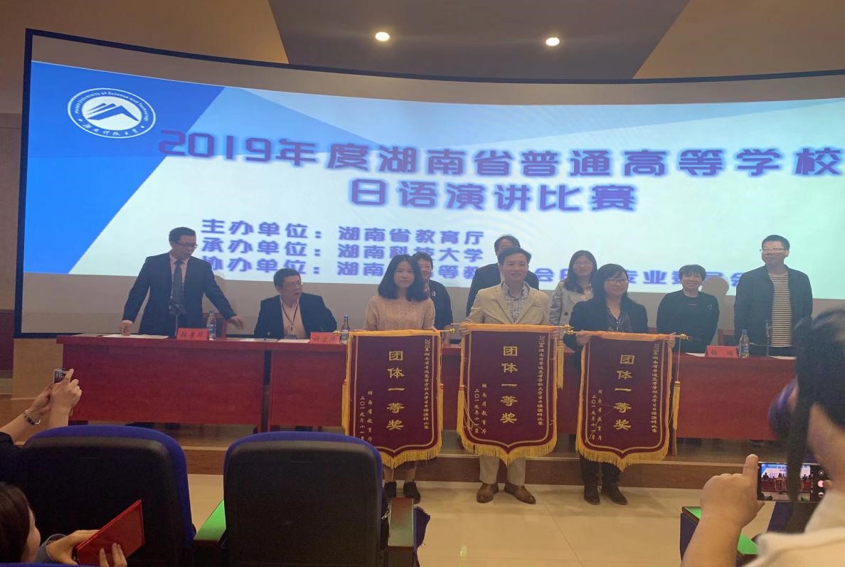 本网讯(通讯员 吴雅格 翟振宁)2019年 11月16日,由湖南省教育厅主办的2019年度湖南省普通高等学校大学生日语演讲比赛在湖南科技大学成功举行。本次大赛,在符婷、庹丽珍、王雯三位老师的精心指导下,我校日语系学子与省内其他高校的学子同台竞技,表现优异,收获颇丰,三名选手荣获省级大奖以及我校荣获团体一等奖。