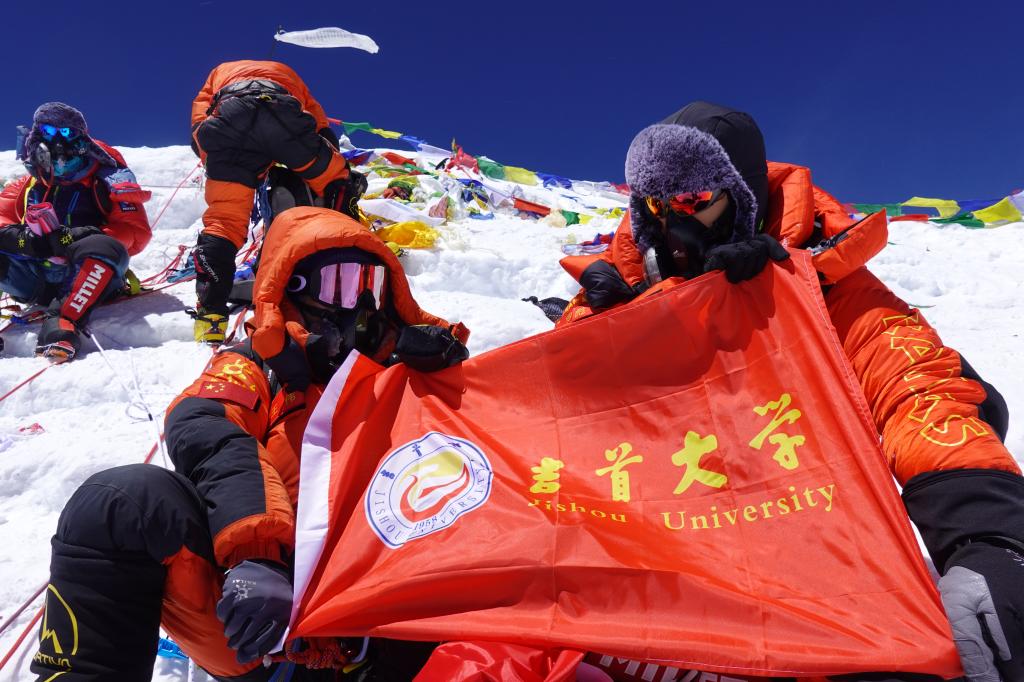 王伟抵达山顶后,拿出事先精心准备的吉首大学校旗,请队友拍下了手挚母校校旗的照片。那一刻,是一位吉大学子在世界屋脊以一位登山者特有的方式,向母校传达特殊的问候与美好祝福。“带着母校校旗去登顶珠峰,让校旗在世界之巅飘扬。在经历异常艰难后,我最终实现了梦想”,王伟欣慰地说。