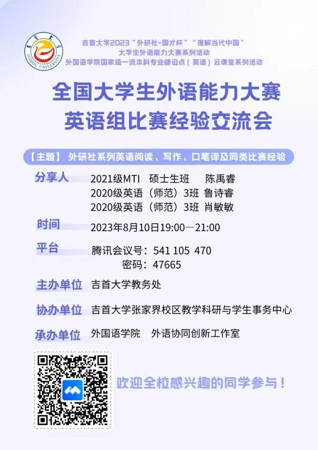 本网讯(通讯员朱芳东、侯璐、修伟)8月10日晚7:00我校“外研社·国才杯”大学生外语能力大赛英语组比赛经验交流会暨2023年“理解当代中国”外语能力大赛动员会在线上如期举行。活动由学校教务处主办,张家界校区教科研学中心协办,乐鱼(中国)承办,全校报名参加年度比赛的各专业本科生及硕士研究生近100人与会,会议由外语协同创新工作室来自2022级的英语师范生田祖明主持。