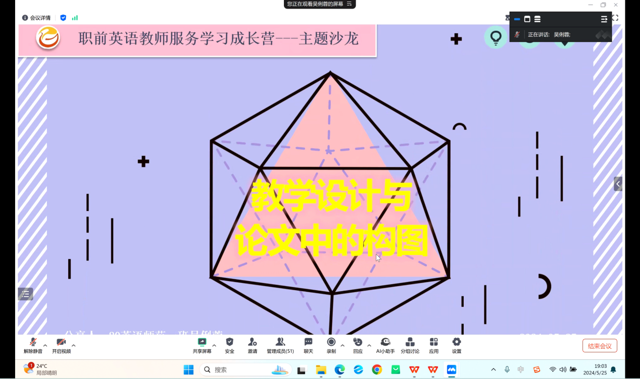 本网讯(吴俐蓉)5月25日晚7:00,乐鱼(中国)通过腾讯会议在云端举办了职前英语教师服务学习成长营第一期主题沙龙,邀请2020级英语师范生吴俐蓉同学做题为“教学设计与论文中的构图”主题分享。2021,2022,2023级英语师范生近100人参与,活动由修伟老师主持。