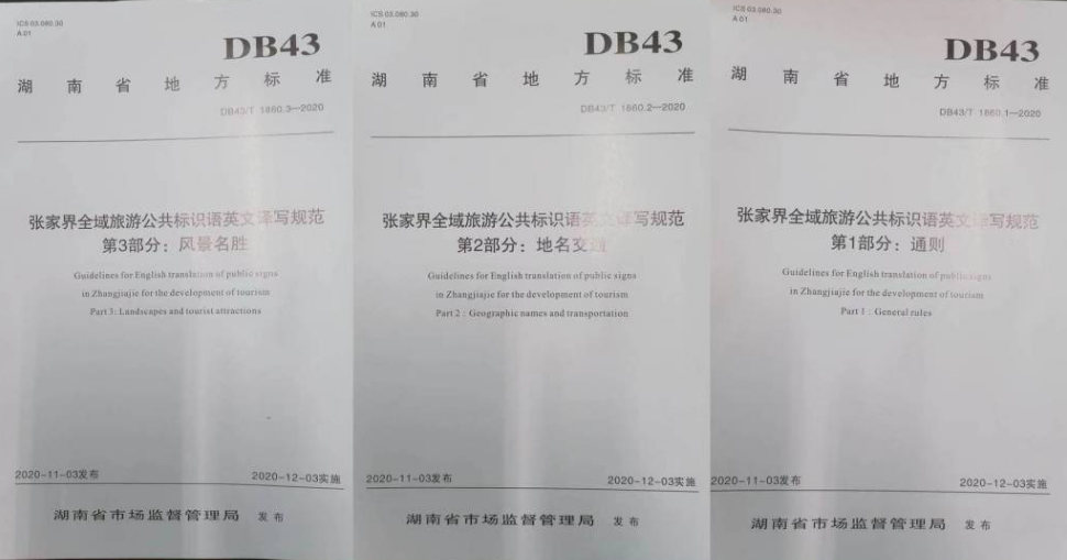 该系列标准文本是湖南省首次为公示语翻译所研制的系列地方标准,分为《张家界全域旅游公共标识语英文译写规范 第1部分:通则》、《张家界全域旅游公共标识语英文译写规范 第2部分:地名交通》、《张家界全域旅游公共标识语英文译写规范 第3部分:风景名胜》三个标准文本。《通则》规定了张家界市全域旅游公共服务领域标识语英文译写的译写原则、译写方法和要求、语法规范以及书写要求,适用于张家界市全域旅游公共领域的机构场所和设施产品名称以及各类公共服务信息的英文译写,为张家界全域旅游双语标识英文翻译提供规范指南。《地名交通》规定了张家界市全域旅游公共服务领域地名及交通公共标识语英文译写的译写原则、译写方法与要求、语法规范以及书写要求等,适用于张家界市地名标志及交通服务领域中的交通设施、交通服务信息标识的英文译写,为张家界市全域旅游地名及交通服务信息双语标识英文翻译提供规范指南。《风景名胜》规定了张家界市全域旅游风景名胜及相关服务信息英文译写的译写原则、译写方法与要求、语法规范以及书写要求等,适用于张家界市风景名胜及相关设施场所、物品物种名称和各类旅游服务信息的英文译写,为张家界市全域旅游风景名胜相关服务信息双语标识英文翻译提供规范指南。