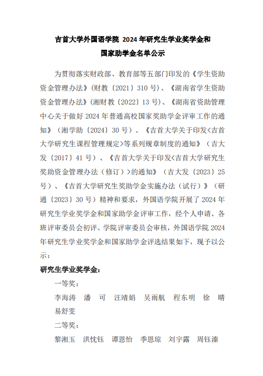 乐鱼网页版2024年研究生学业奖学金和国家助学金名单公示