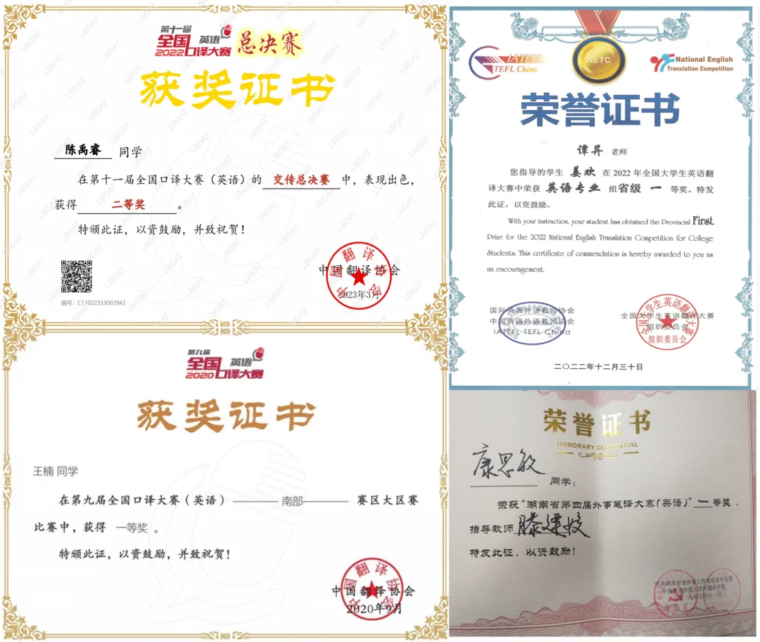 近四年乐鱼网页版翻译专业学生获得的部分学科竞赛奖励证书